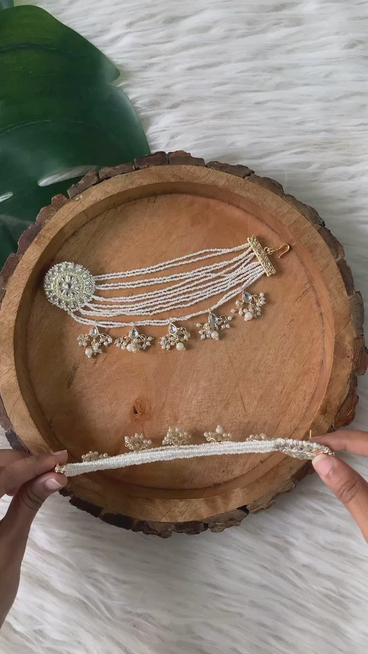 Aarini Earchain is a unique statement piece that adds the ultimate special touch to any outfit. Adorned with intricate kundan work, this accessory effortlessly elevates your style and provides that perfect appearance without trying too hard. Whether you're attending a special event or simply want to stand out, the Prashima Earchain works wonders and ensures you make a lasting impression.