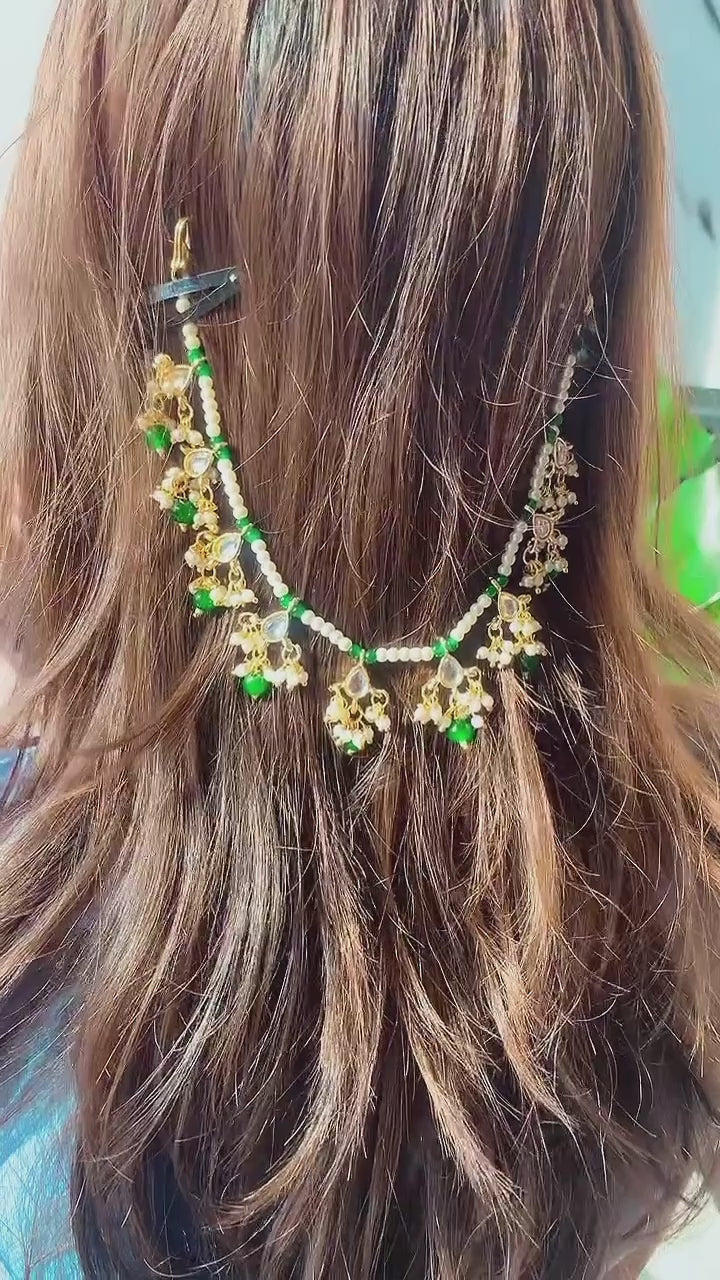 This is an elegant multi-layered pearl hair accessory adorned with Kundan embellishments and delicate golden charms. Perfect for weddings and festive occasions, it adds a royal touch to your hairstyle with its graceful drape and intricate detailing. ✨