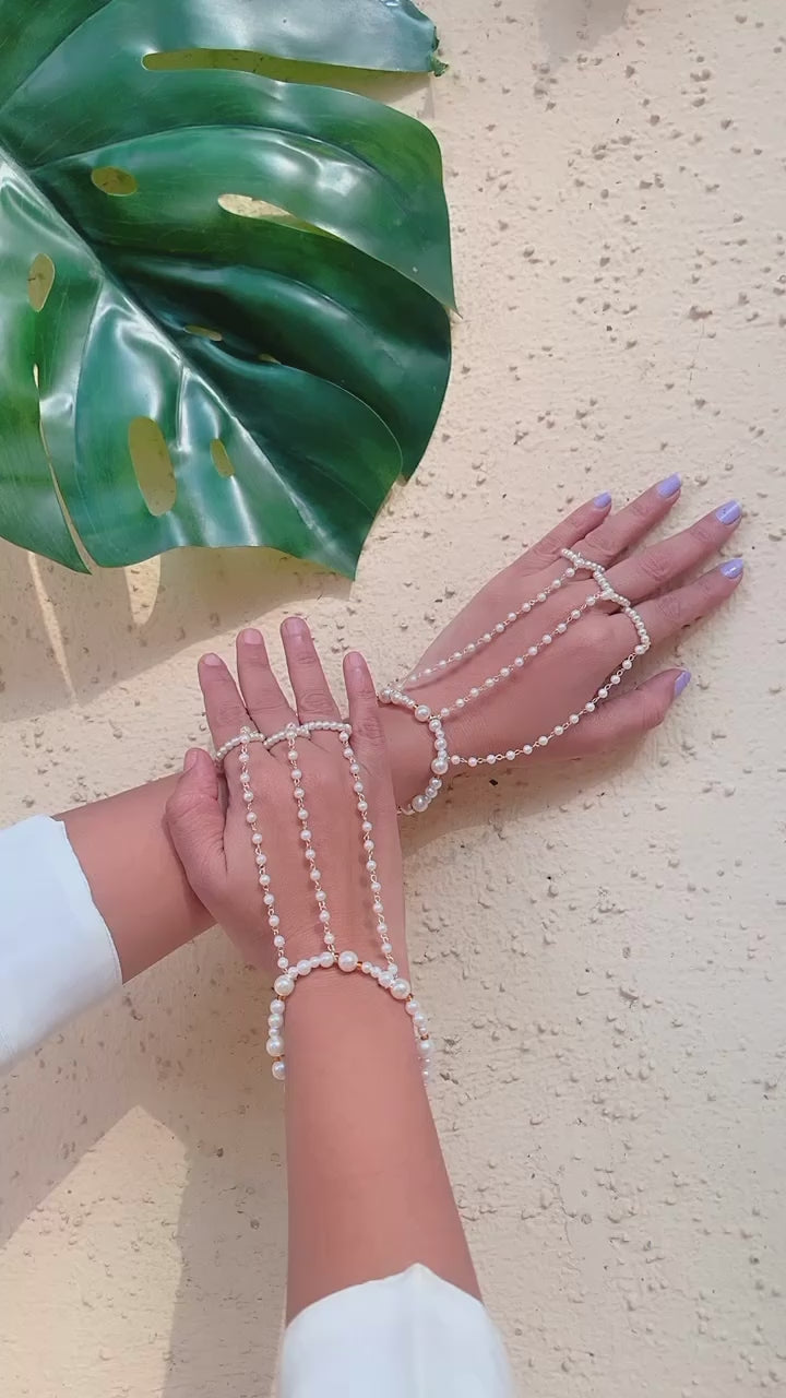 This haathpanja is intricately crafted in 18K gold plating. It's embellished with pearls.This captivating indian jewellery bracelet is a great gifting option and is a perfect pick to add to your jewelry collection. You can style it with ethnic or western clothing.
