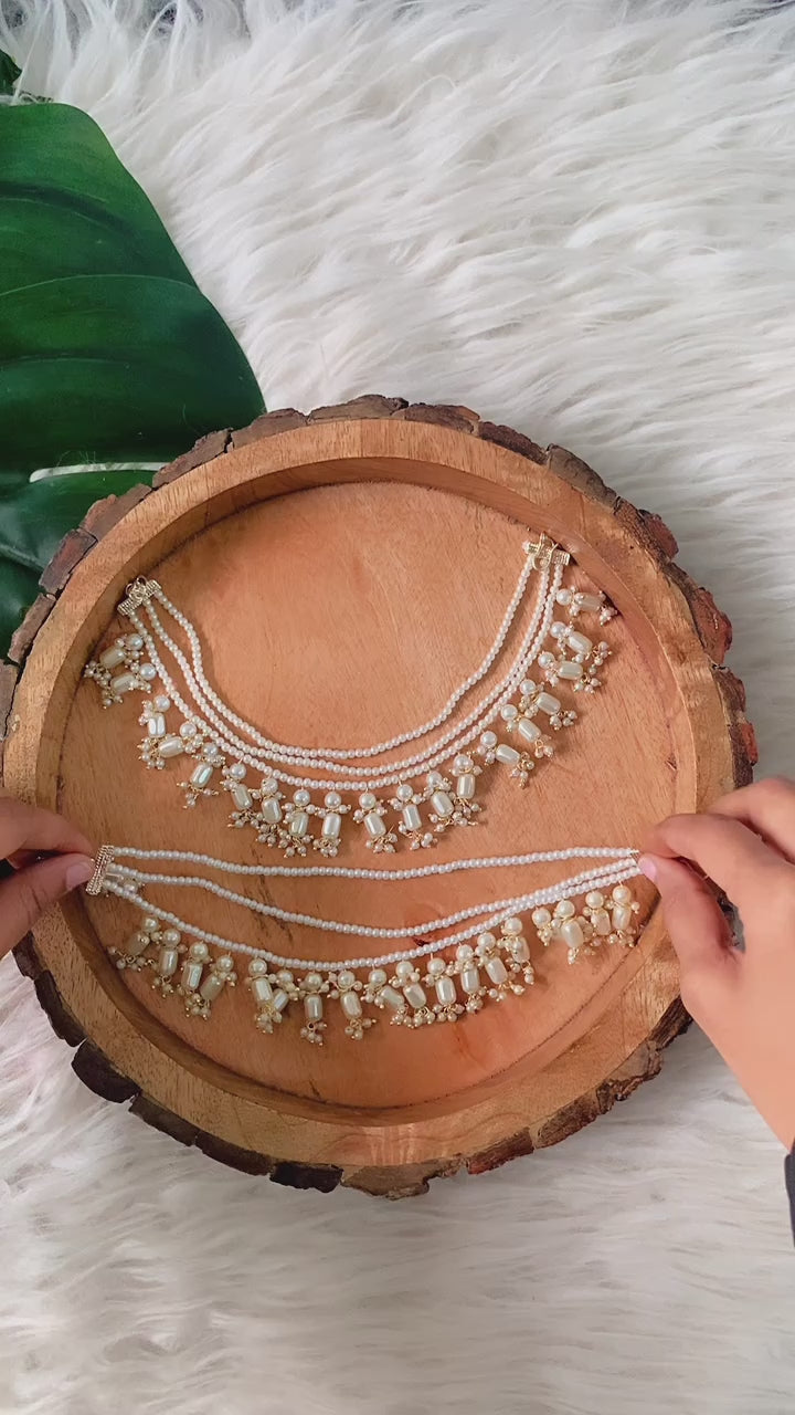 Dua White Earchain! Made up of delicate white lavish pearl details, dangling at each end, this exquisite piece is more than just an accessory - it's a statement of sophistication. Whether you're headed to a special occasion or just stepping out for the day, this accessory is sure to catch eyes.We are sure these earrings will complete your festive dressing with zero hassle!