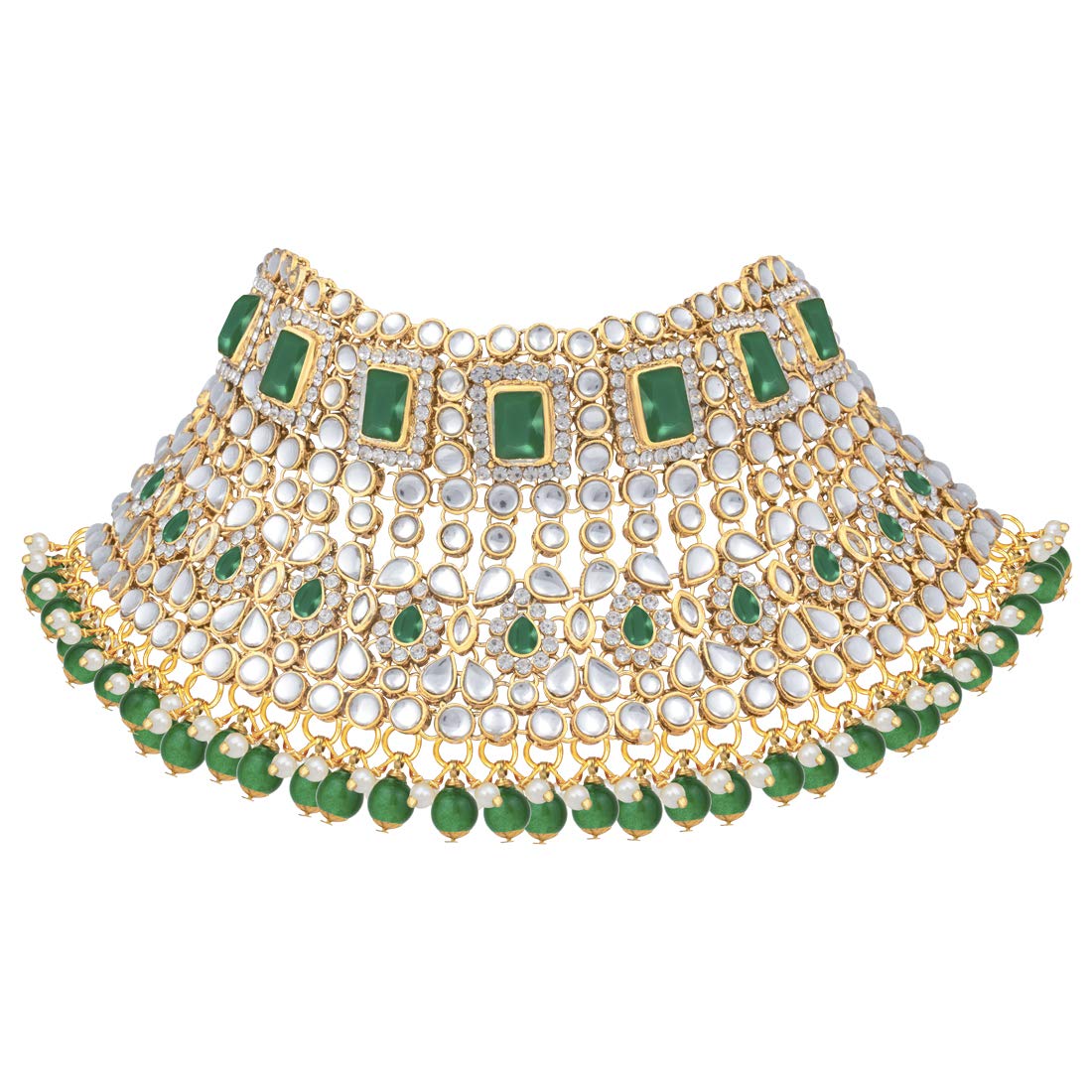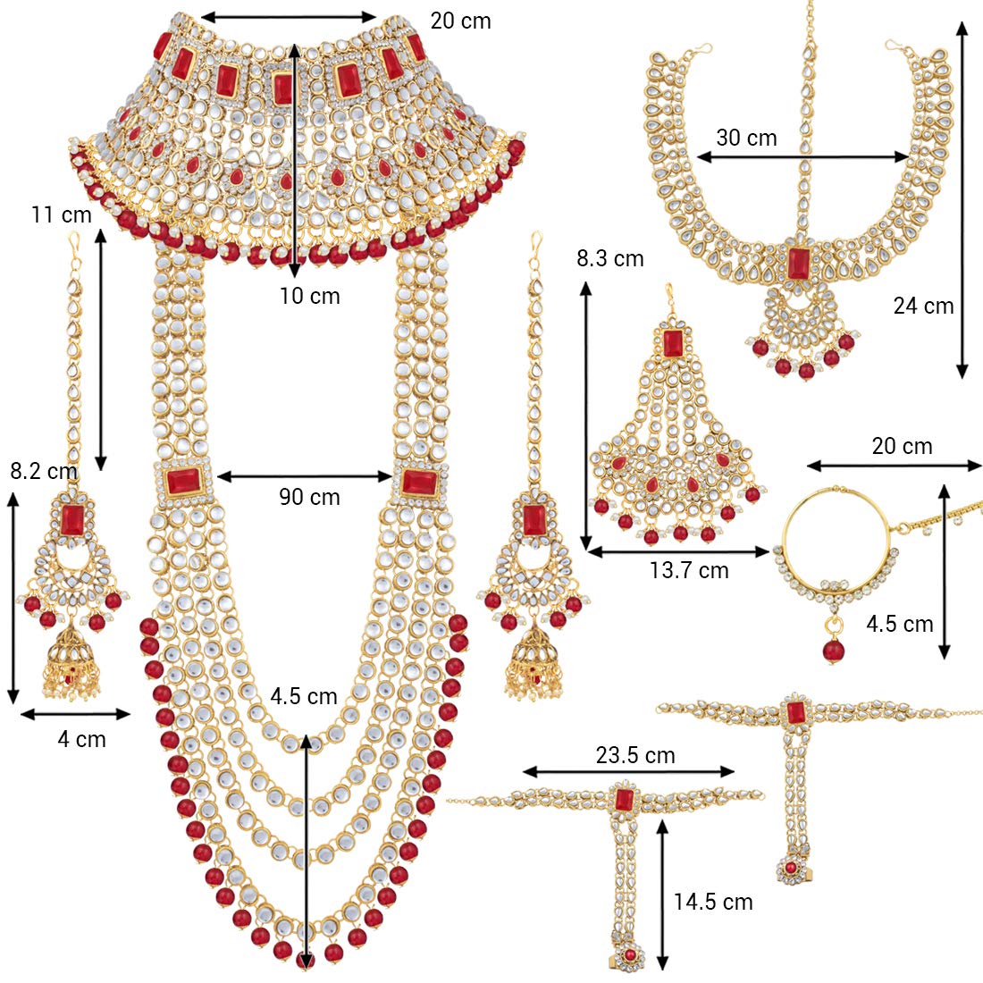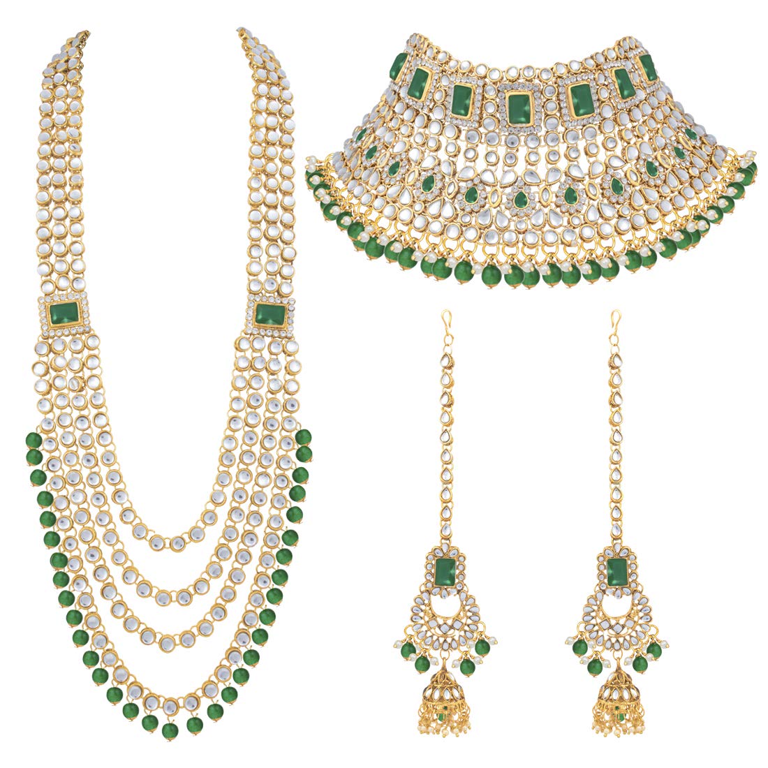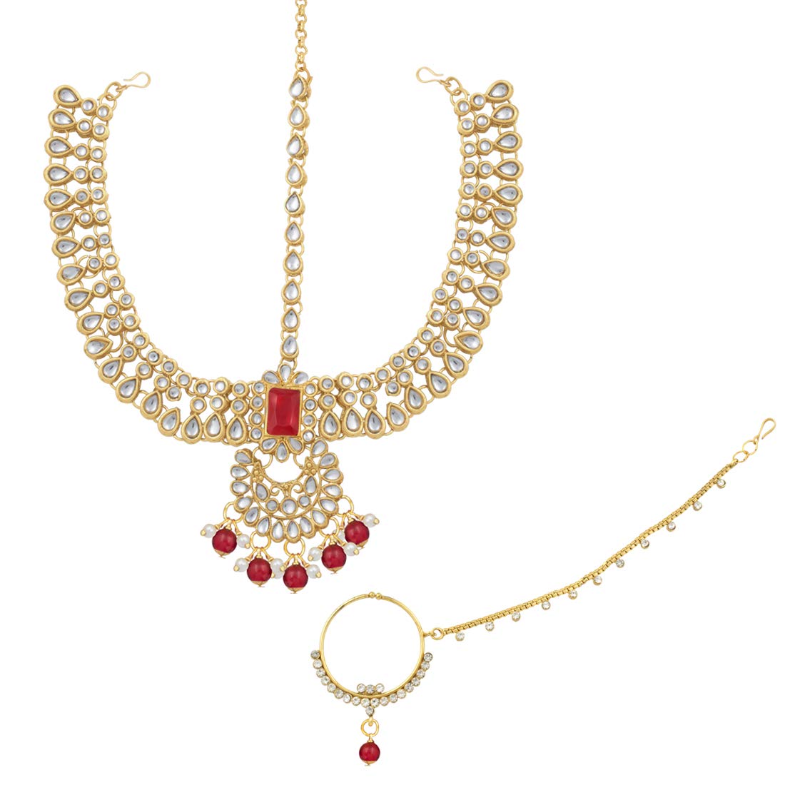 Bridal choker Set with Long necklace studded with Kundan & Pearls. This choker comes along with earrings, passa, haathpanja, nose ring & maang tikka. This captivating indian jewellery set is a great gifting option and is a perfect pick to add to your jewelry collection. You can style it with ethnic or western clothing.